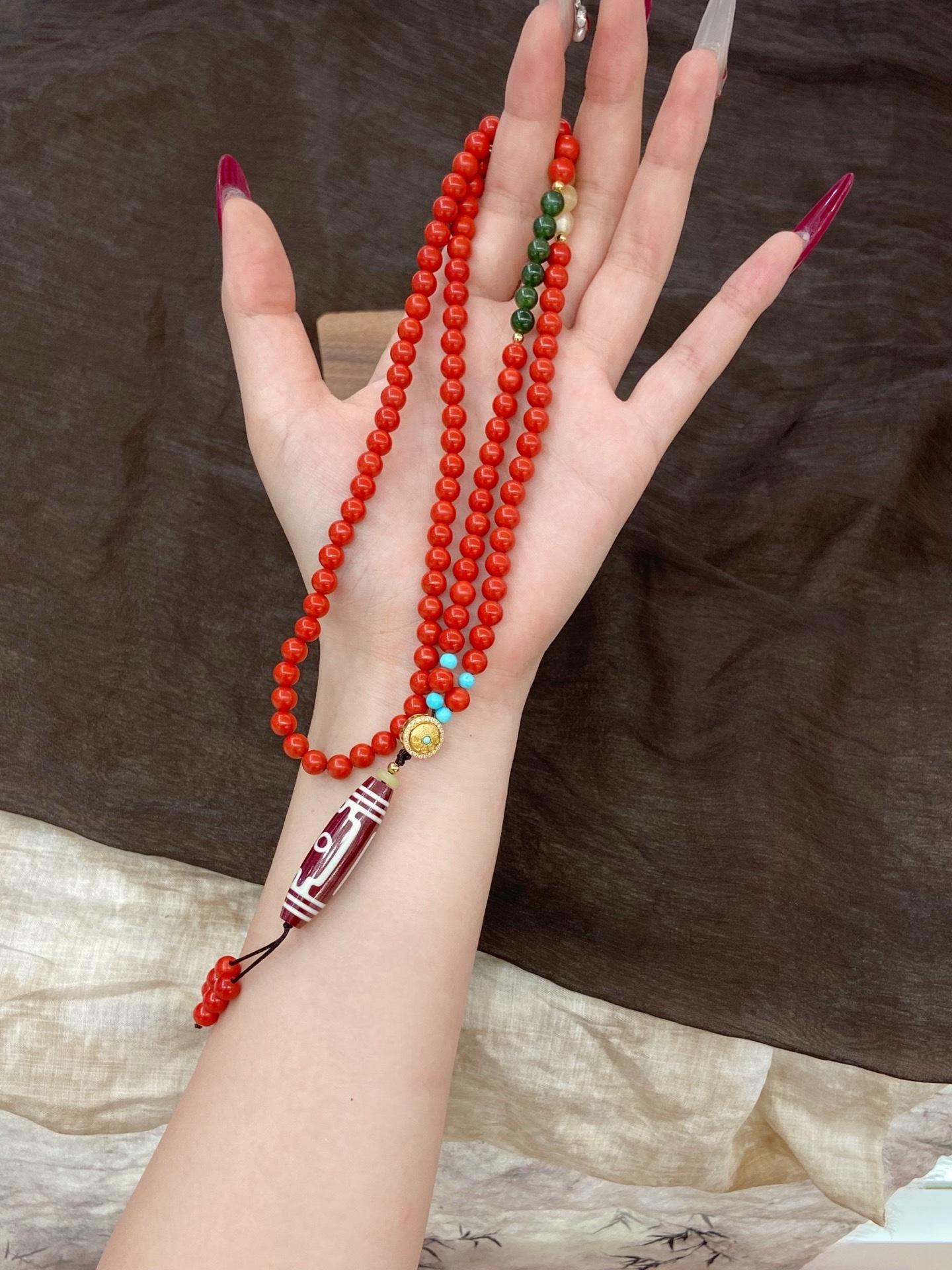 6mm红砂搭配蜜蜡、和田玉、银镀金转经筒、朱砂天珠